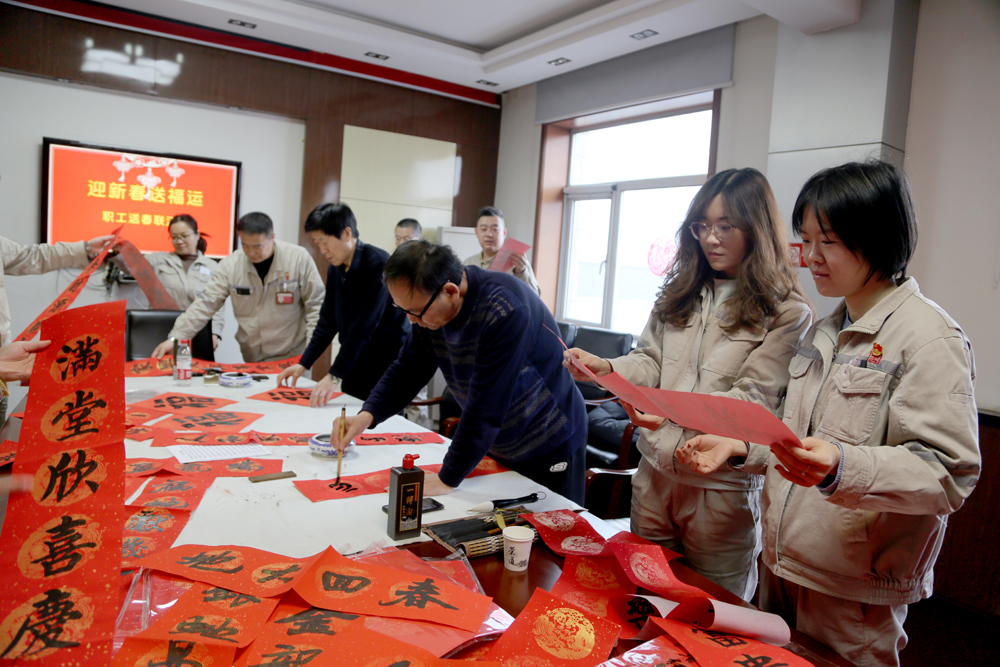 本网讯 春节将至,唐山热电公司工会精心组织了丰富多彩的新春活动,邀请书法爱好者为职工们撰写春联、福字,组织迎新春游艺活动,营造了浓厚的新春氛围。活动现场,职工们聚集在书法爱好者身边,精心挑选着心仪的书法作品。一个个苍劲有力的福字,一幅幅寓意吉祥的春联,引得职工们拍手称赞,活动将该公司的新春氛围引入了高潮。