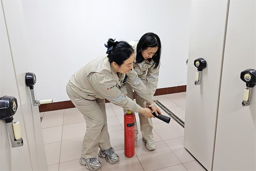 演练前,该公司将档案安全知识与消防技能培训结合,安全监督部消防人员重点讲解档案库房温湿度异常预警、老旧线路隐患排查等专业要点,现场演示二氧化碳灭火器“提、拔、握、压”操作,将档案保护规范与消防应急技能转化为可量化的操作流程。