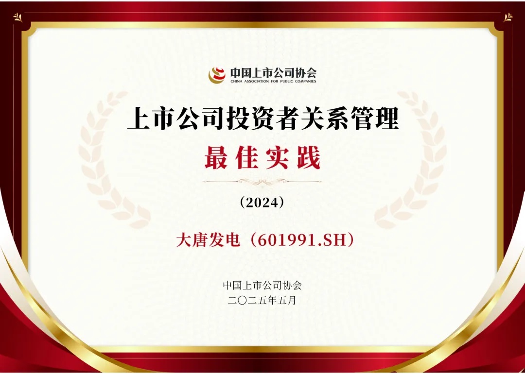 本网讯 近日,中国上市公司协会在北京发布“中国上市公司2024年度投资者关系管理最佳实践”评选结果,大唐发电凭借在投资者关系维护、投资者回报、信息披露与公司规范运作等方面的优异表现,首次获评“上市公司投资者关系管理最佳实践”。