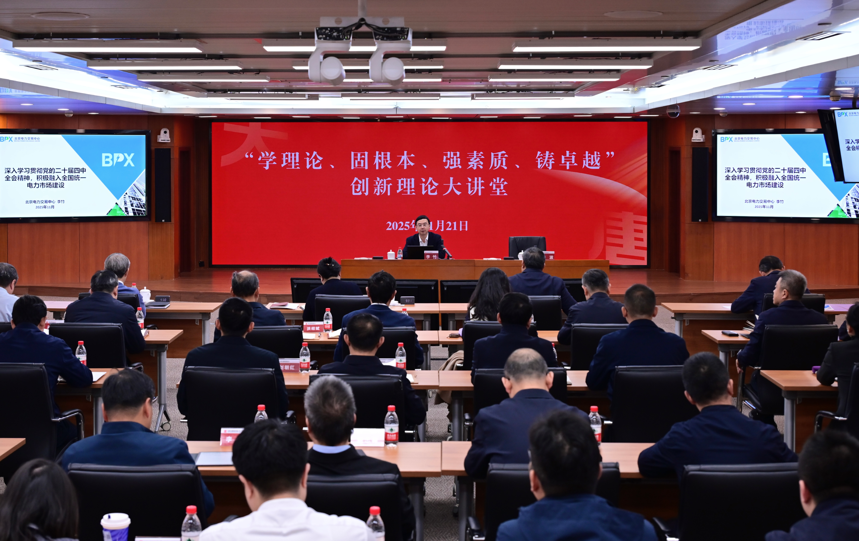 11月21日,中国sunbet申搏官方网站“学理论、固根本、强素质、铸卓越”创新理论大讲堂再度开讲,邀请北京电力交易中心有限公司副总经理、能源行业电力市场技术标准委员会副主任委员李竹作《深入学习贯彻党的二十届四中全会精神,积极融入全国统一电力市场建设》专题讲座。集团公司董事、党组副书记余波主持讲座,集团公司领导王瑛、曲波、陶云鹏、苟伟参加讲座。