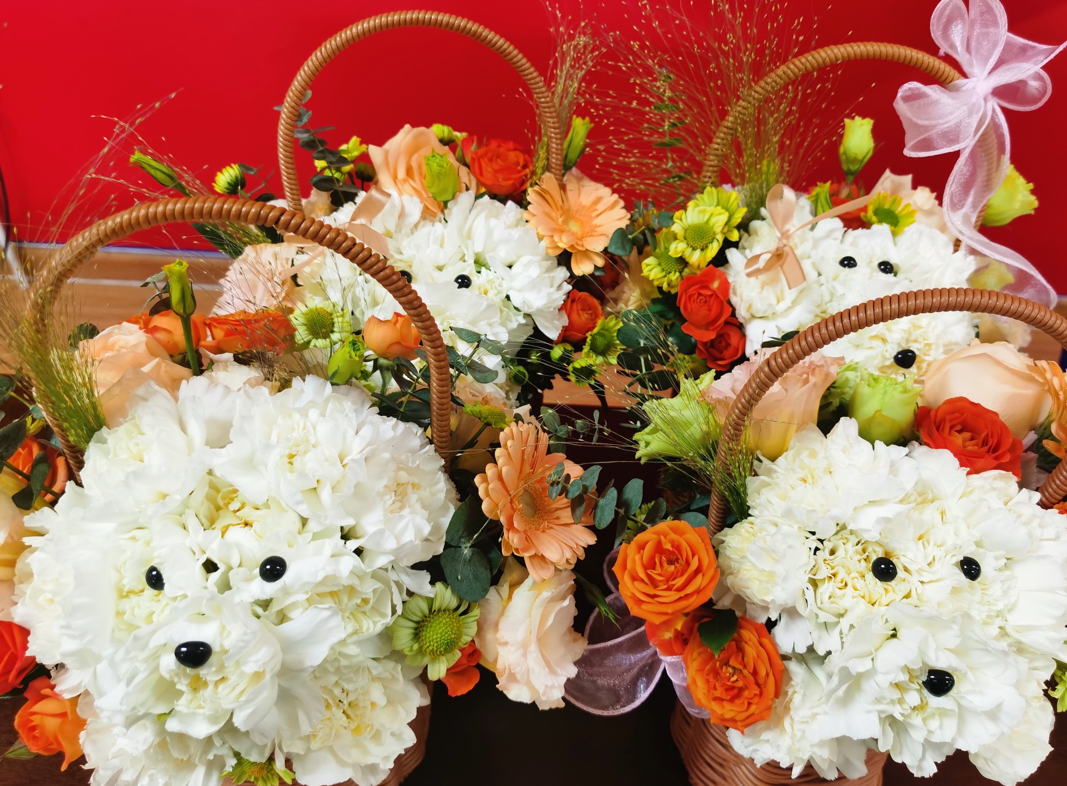 花艺老师先是简单介绍了插花艺术的起源、发展、工艺等方面知识,随后向大家介绍了此次艺术插花所使用到的花的种类。实践环节,在花艺老师的指导下,女职工手中白色浪漫的康乃馨逐渐呈现出萌萌的眼睛,嘟嘟的小嘴,在一双双巧手下,一个个可爱的小狗造型呼之欲出。大家发挥想象力和创造力,在主花的周围整合造型,原本简简单单的花草在女职工们的手中变成美丽的花篮。大家看着自己亲手制作的插花作品,感到满满的幸福和成就感。