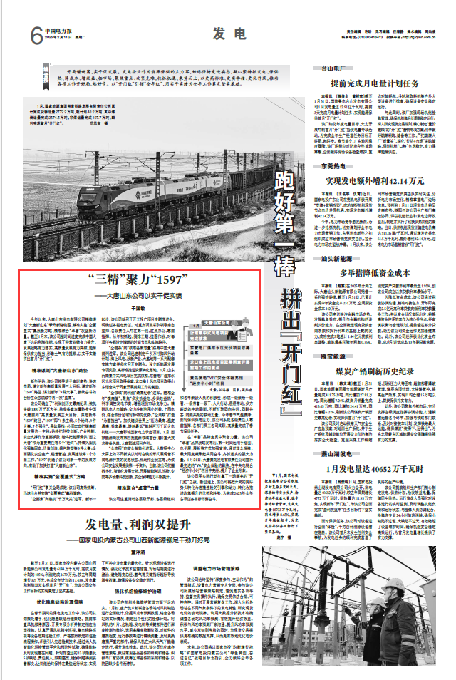 今年以来,大唐山东发电有限公司精准谋划“大唐新山东”攀升新路线图、精准实施“全覆盖式”赢战新方略、精准聚合“卓著”攻坚新力量。截至1月末,该公司超时间进度完成中国大唐下达的利润指标,实现了经营业绩有力提升、发展战略有力落实、高质量发展有力突破、能源保供有力担当、形象士气有力提振,以实干实绩拼出首月“开门红”。