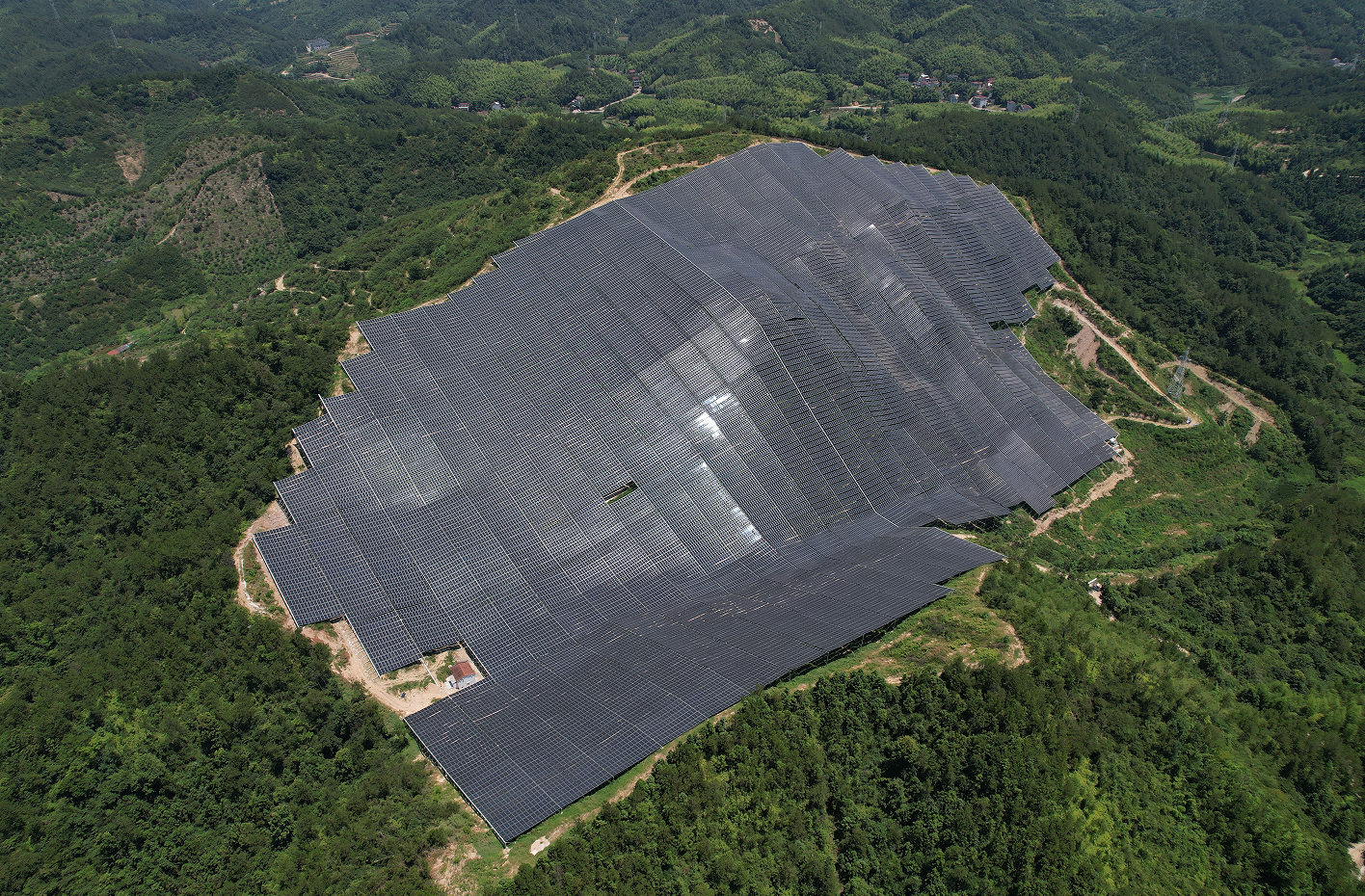 浙江大唐新能源唐云光伏电站位于平均海拔800米的丽水市缙云县山上,次第有序的光伏组件沿着高低起伏的山脉,映衬着绿色植被,恰似为山顶戴上一顶帽子。目前,唐云光伏电站项目已经建成投产,它采用山地柔性支架技术,能将土地利用率最大化,预计每年可产生清洁能源3258万千瓦时。