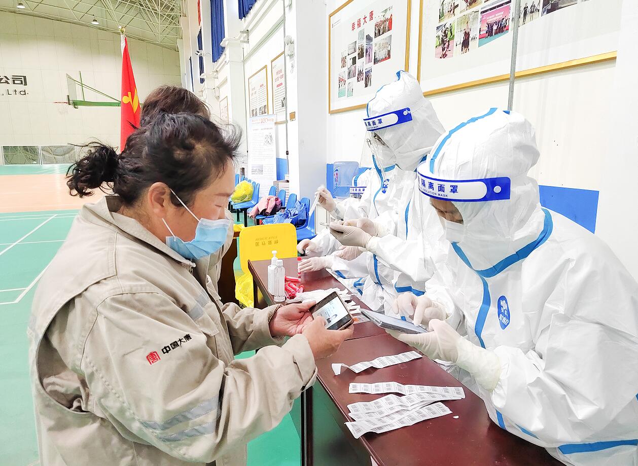 党员突击队连续5、6个小时滴水不进,直到最后一位职工检测完毕。此时,他们的衣服已湿透、手已泛白,但眼神仍然坚定,笑容依旧亲切。
