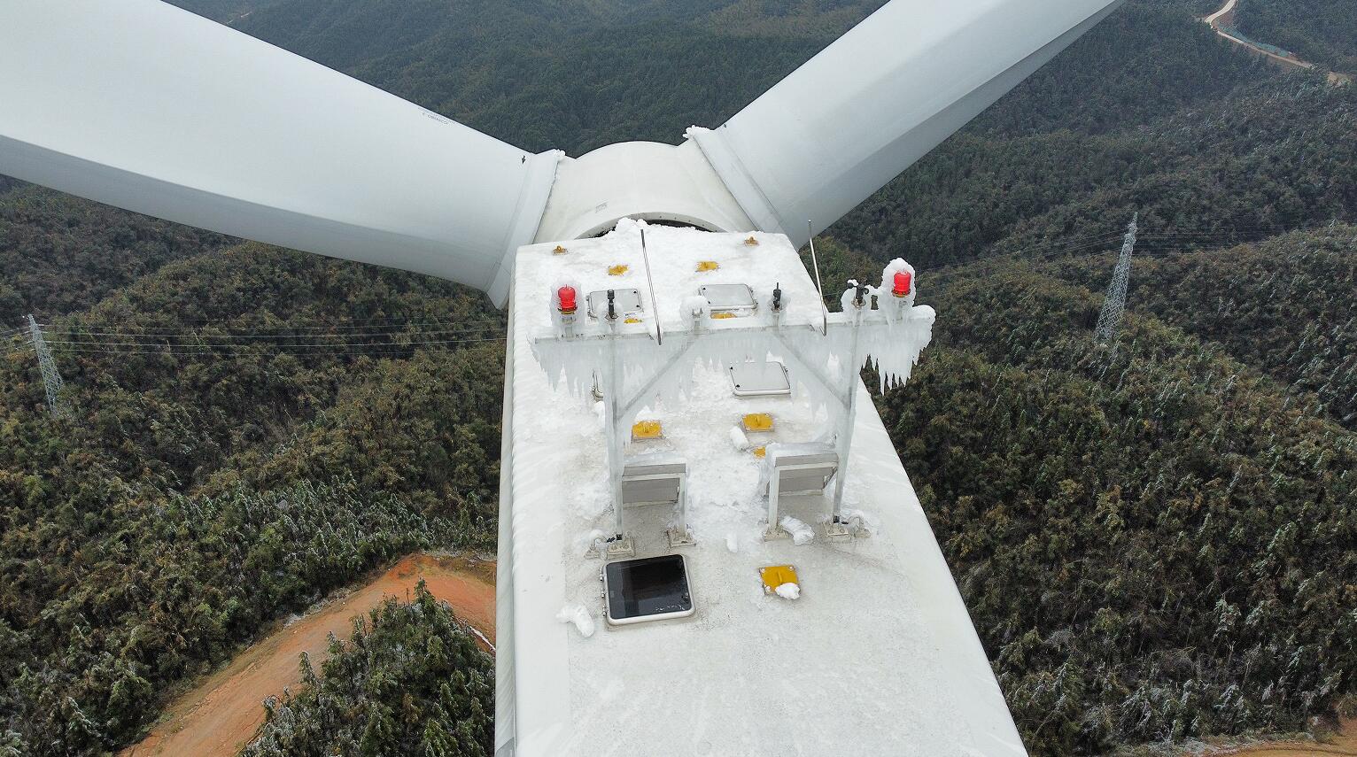 在此次覆冰前后的过程中,江西新能源公司运维人员紧盯设备情况,覆冰时及时手动停机,对解除覆冰的风机开展现场查看,确认后进行启机,13个场站成功处理并解决7次因冰雪造成的集电线路和外送线路跳闸事件和多台箱变外壳被叶片融冰砸损情况。