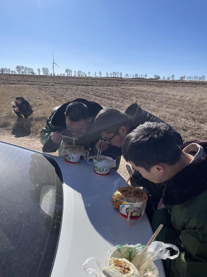 在风场值班时,一日三餐只能是泡面、自热米饭这类速食品。为方便下班的同事吃饭、保证饮食安全,大家在住宿宾馆附近选择一家小餐馆,作为值班回来就餐的“定点食堂”。接上完成交接班的同事们,我们一起去体验了“食堂”。晚餐过程中,大家说说笑笑,精神状态很不错,完全看不出已经在风场风餐露宿了两周多时间。