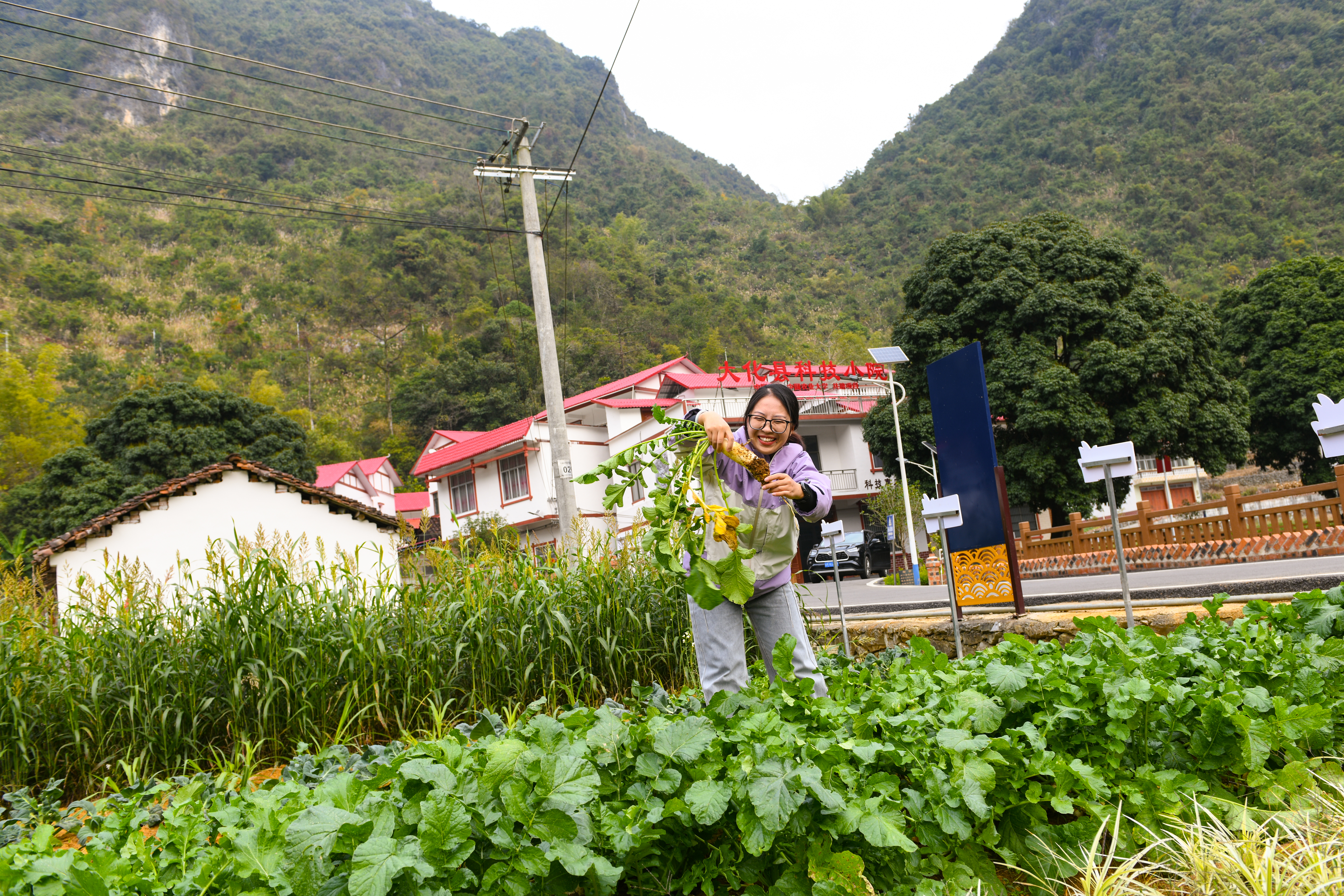 在大化县科技小院的试验田里,中国农业大学硕士研究生李梦鑫正一边愉快地收割自己种植的萝卜、胡萝卜、生菜等蔬菜,一边给前来参加“科技兴农 高效养殖”培训会的大化县丹桂村的村民讲解不同萝卜、胡萝卜在外形、口感、营养价值等方面的差异,以及如何根据市场需求和当地环境选择合适的种植品种。