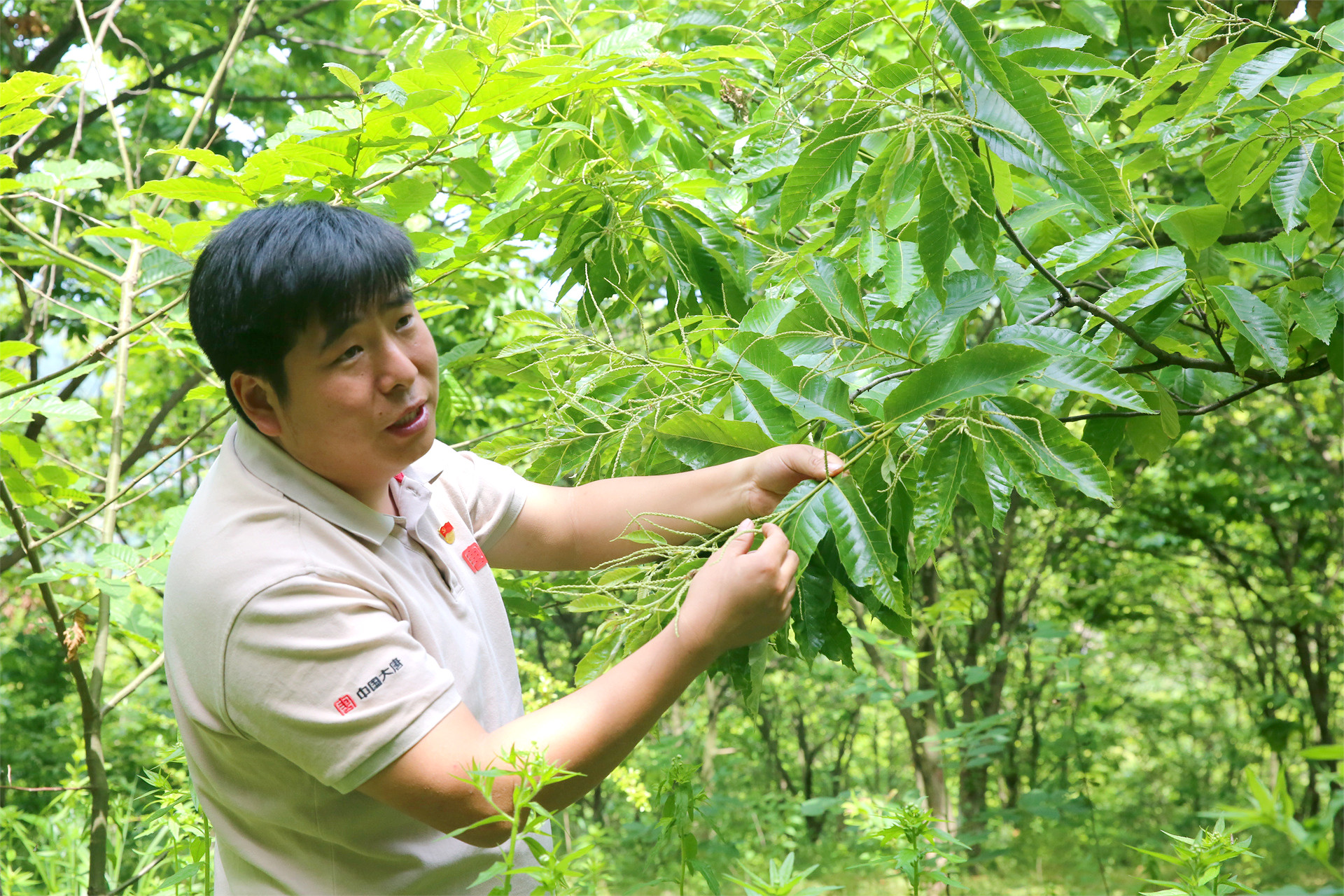 方名兴时常前往板栗、脆李种植地查看长势、有无病虫害。在他看来,这些就是新安群众的“致富树、小康树”。和群众一起查看了一片板栗林后,他指着一枝树叶泛黄的板栗树说:“看,这棵已经感染板栗叶黄斑病了!这是霉菌侵害到叶子出现黄斑,然后逐步扩散到整个叶片、枝条,后期病斑中部坏死变黄褐色, 严重影响板栗产量,我们要尽快治理。”