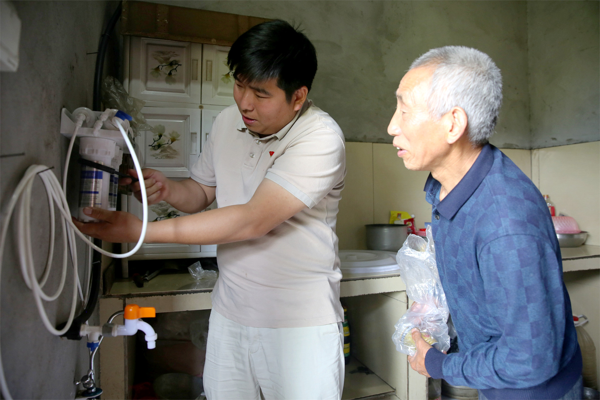 为老人查看了账户情况,陪老人聊完天,方名兴处理了公务后,就赶着去老刘家帮忙更换净水器滤芯——他家住在半山腰上。长期以来,老刘一家和周边的4家住户,都靠附近一处山平塘积蓄的雨水生活。天一热,山平塘的水细菌、绿藻迅速滋生,散发出难闻的气味。这样的水很不卫生,大家苦不堪言。